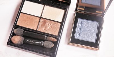 発色はもちろんですが、ジルスチュアートらしい柔らかいフローラルの香りがするアイシャドウ。重ねれば重ねるほど透明度が増す左上のアイベース。右上のアクセントカラー。