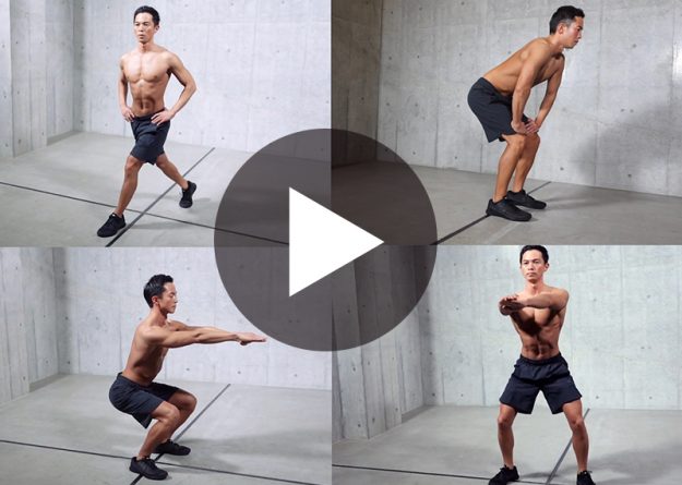 〈動作名〉 クロスランジ ハーフスクワット エアー・チェアー ワイドスクワット 〈ポイント〉 ■クロスランジ 1、上半身は常に前を向いたままにする 2、クロスする足は外を向き過ぎないように注意する ■ハーフスクワット 1…