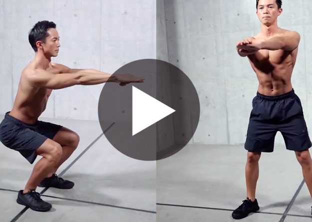 〈動作名〉 エアーチェアー ワイドスクワット 〈ポイント〉 ■エアーチェアー 1、もも床と平行になるまでしゃがみ、キープする 2、手を前に出しバランスをとる ■ワイドスクワット 1、脚は肩幅で開き、外向きにする 2、ゆっ…