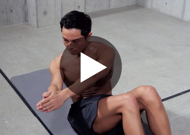 〈動作名〉 ツイスト 〈ポイント〉 1、顔と胸が常に同じ方向を向くようにする 2、膝は閉じて90度に曲げる 〈部位〉 脇腹