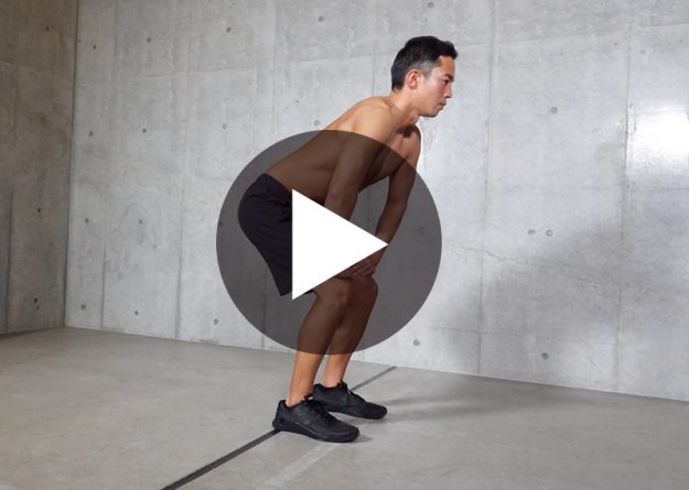 〈動作名〉 ハーフスクワット 〈ポイント〉 1、お尻を後ろに突き出すイメージで、膝をつま先より前に出さないように気をつける 2、背筋は常に伸ばしたままにする 〈部位〉 太もも 尻