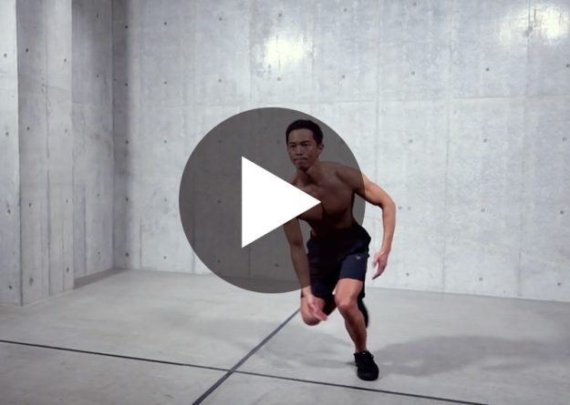 〈動作名〉 ラテラル・ホップ 〈ポイント〉 1、着地のときに膝を使って衝撃を吸収する 2、上半身を使ってテンポ良く行う 〈部位〉 全身 脚