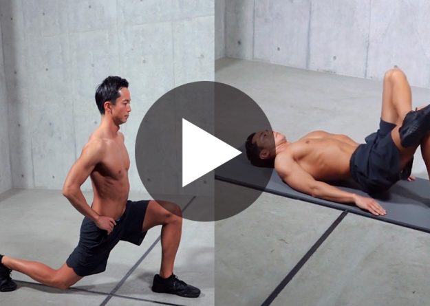 〈動作名〉 ・ランジ ・ヒップリフト 〈ポイント〉 ランジ 1、太ももとすねが垂直になるようにする 2、上体は垂直に保つ ヒップリフト 1、お尻を上げる際は踵で床を押す 2、股関節をしっかり伸ばす意識をする 〈部位〉 尻