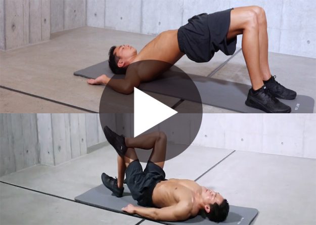 〈動作名〉 スパイン・ヒップリフト ヒップリフト 〈ポイント〉 ■スパイン・ヒップリフト 1、膝を立てて仰向けに寝る 2、膝から頭まで一直線になるように尻を持ち上げる ■ヒップリフト 1、お尻を上げる際はかかとで床を押す…