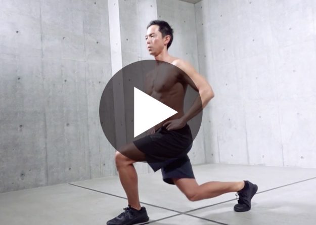〈動作名〉 クロスランジ 〈ポイント〉 1、上半身は常に前を向いたままにする 2、クロスする足は外に向き過ぎないように注意する 〈部位〉 ・脚 ・お尻
