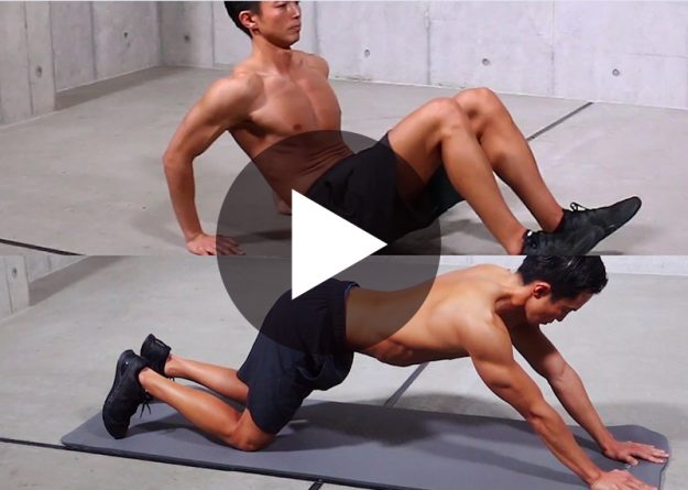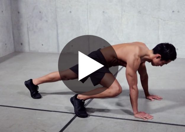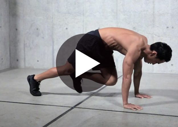 〈動作名〉 マウンテンクライマー 〈ポイント〉 1、腰が上下に動かないように固定する 2、腹の下まで脚を引き寄せ、素早く戻す 〈部位〉 ・全身